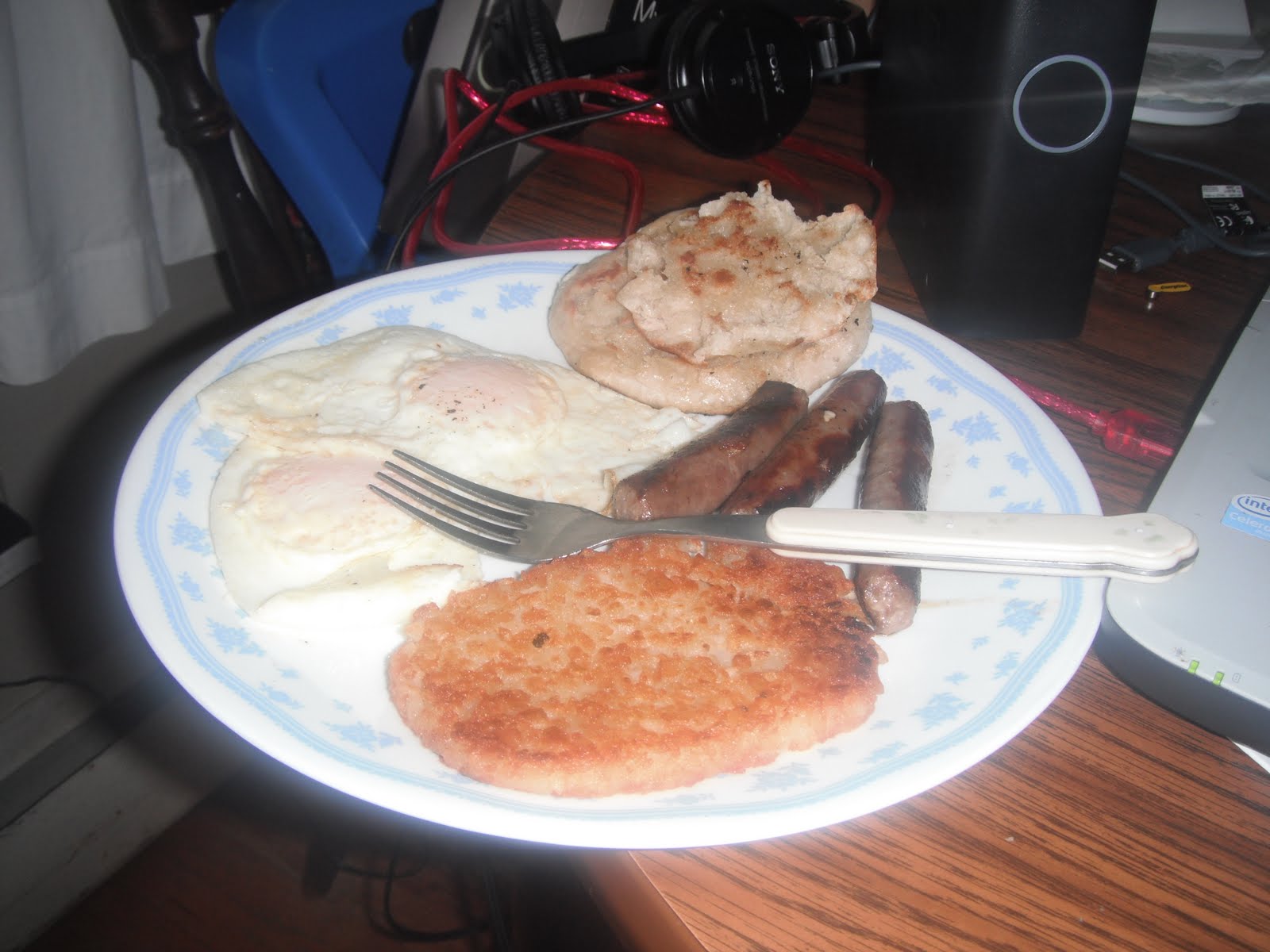 While the files were transferring I decided to make breakfast. I knew that I would be alone this morning because my hubby worked all night til about 6am.. and my son didn’t get home from work til around 3am. So I made myself some eggs, sausages, hash browns and english muffins.